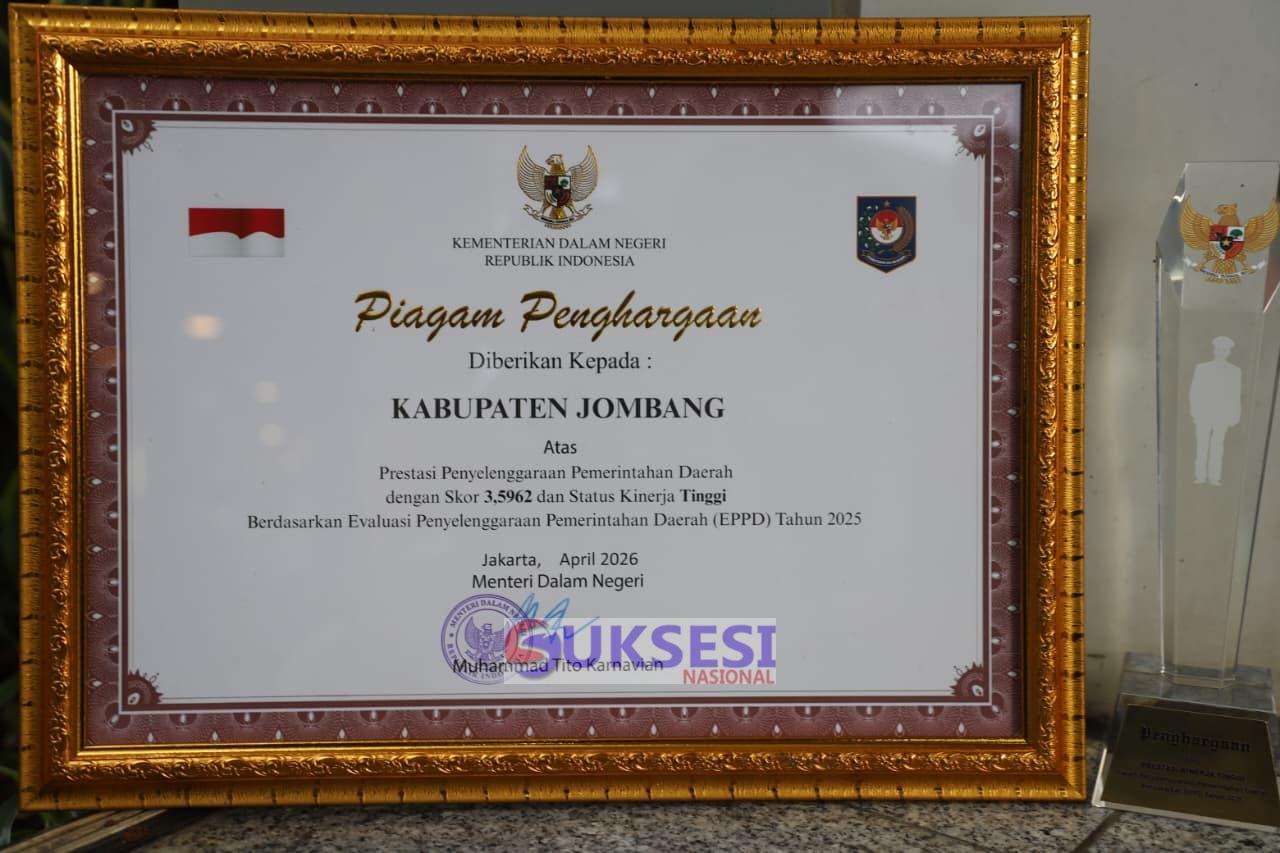 Suksesinasional.com JOMBANG – Pemerintah Kabupaten Jombang, Jawa Timur kembali menorehkan prestasi gemilang di tingkat nasional. Bupati Jombang, Warsubi, S.H., M.Si., menerima Piagam Penghargaan Hasil Evaluasi Penyelenggaraan Pemerintahan Daerah (EPPD) dalam upacara peringatan Hari Otonomi Daerah (Otoda) XXX yang digelar di Plaza Kementerian Dalam Negeri, Jakarta Pusat, Senin (27/4/2026).