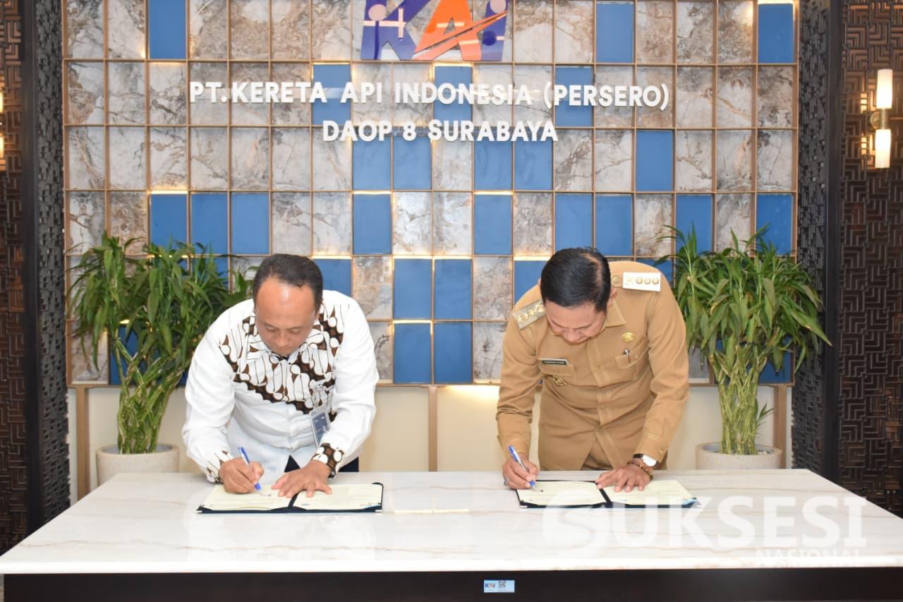 Suksesi Nasional. Com Lamongan-Bupati Lamongan Yuhronur Efendi lakukan penandatanganan Memorandum of Understanding (MoU) antara Pemerintah Kabupaten Lamongan bersama PT Kereta Api Indonesia (Persero), Selasa (16/9) di Ruang Airlangga Kantor DAOP 8 Surabaya.