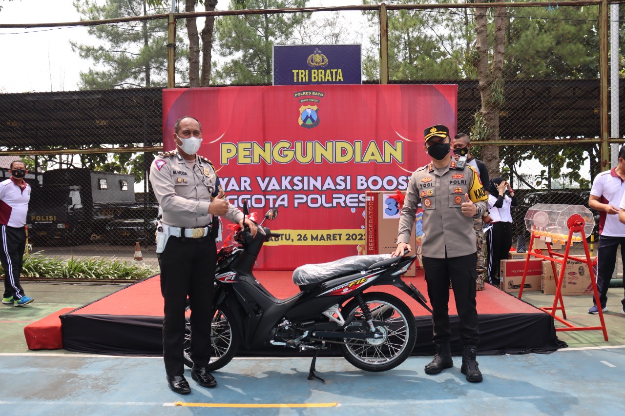 Suksesi Nasional, Batu – Polres Batu kembali membagikan doorprize kepada anggota Polres Batu yang sudah melakukan vaksinasi dosis booster dalam kegiatan olah raga pagi yang dilaksanakan setiap hari Sabtu.