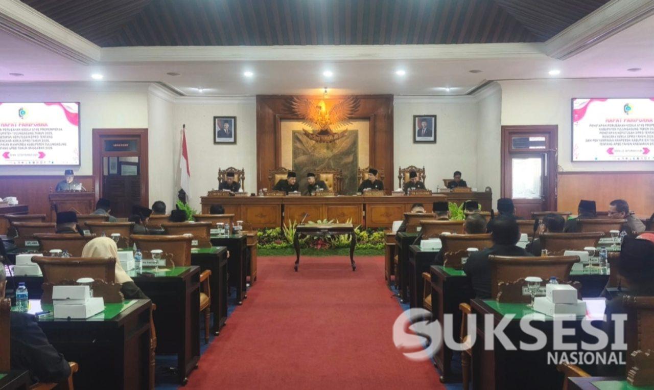 Suksesi nasional. Com Tulungagung – Dewan Perwakilan Rakyat Daerah (DPRD) Kabupaten Tulungagung menggelar rapat Paripurna dengan agenda Penyampaian Rancangan Anggaran Pendapatan dan Belanja Daerah (APBD) Tahun Anggaran 2026, Senin (22/9/2025), di ruang Graha Wicaksana lantai dua.