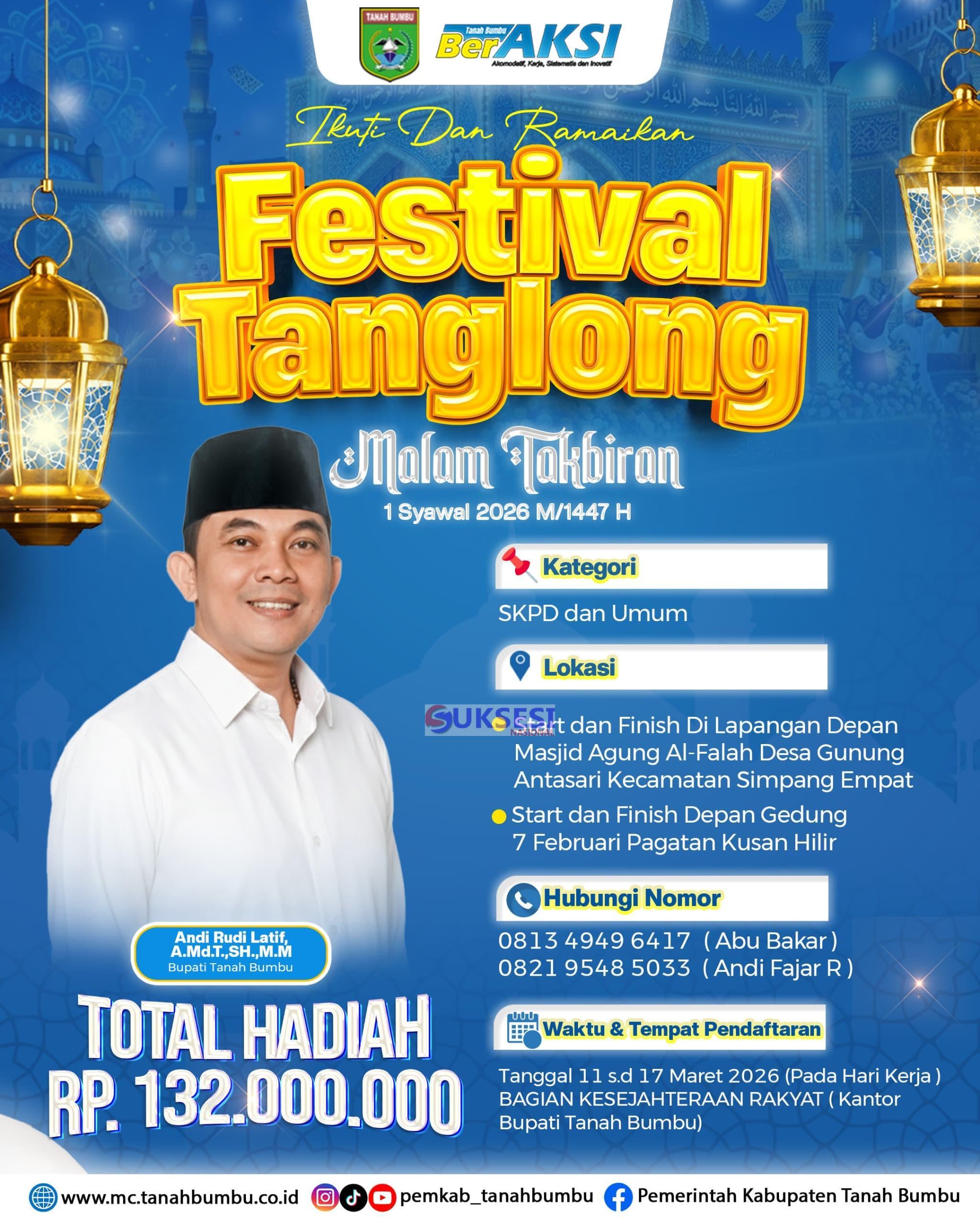 Pemerintah Kabupaten Tanah Bumbu akan menggelar Festival Tanglong untuk memeriahkan malam takbiran Idulfitri 1447 Hijriah atau 1 Syawal 2026. Kegiatan tersebut terbuka bagi peserta dari kategori Satuan Kerja Perangkat Daerah (SKPD) maupun masyarakat umum dengan total hadiah mencapai Rp132 juta.