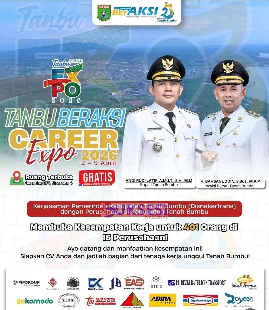 Tanbu Beraksi Career Expo 2026 ini membuka kesempatan kerja untuk 401 orang di 15 perusahaan.