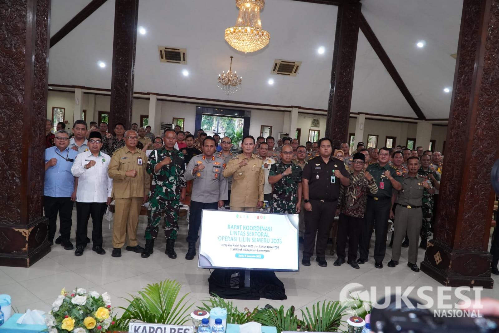 Suksesi Nasional, Lamongan-Jelang perayaan Natal 2025 dan Tahun Baru 2026 (Nataru), Forkopimda Kabupaten Lamongan ikuti rapat koordinasi lintas sektoral yang digelar oleh Kepolisian Resor Lamongan, Senin (15/12) di Pendopo Lokatantra.
