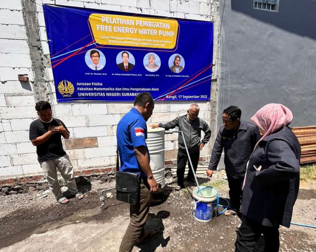Suksesi Nasional.com,Pasuruan – Air merupakan kebutuhan utama dalam pertanian. Apalagi saat musim kemarau, air menjadi kebutuhan pokok. Karena itulah, Univesitas Negeri Surabaya dari Fakultas Matematika dan Ilmu Pengetahuan Alam membuat inovasi bersama anggota Pengabdian Kepada Masyarakat (PKM), melakukan pelatihan pembuatan Free Energi Water Pump di Desa Manaruwi, Kecamatan Bangil, Kabupaten Pasuruan, Sabtu (17/9) pagi.