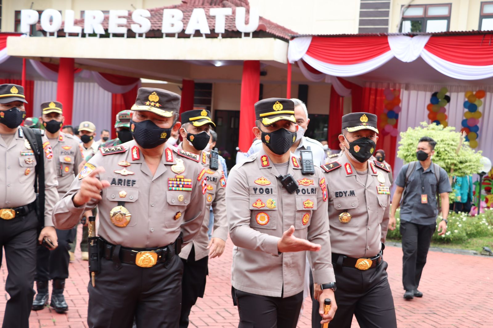 Suksesi Nasional, Malang Batu – Kapolres Batu AKBP I Nyoman Yogi Hermawan bersama Dandim 0818 Malang-Batu Letkol Inf. Taufik Hidayat serta Pejabat Utama dan Pabung Kodim 0818 Malang-Batu mendampingi kunjungan kerja Kepala Badan Pemeliharaan Keamanan (Kabaharkam) Polri Komjen Pol. Arief Sulistyanto, Direktur Bidang Pemolisian Masyarakat Korps Pembinaan Masyarakat Badan Pemeliharaan Keamanan (Dir Bid Polmas Kor Binmas Baharkam) Polri dan Direktur Utama (Dirut) Jasa Raharja Persero Bapak Rivan Achmad Purwantono di Polres Batu Polda Jatim.