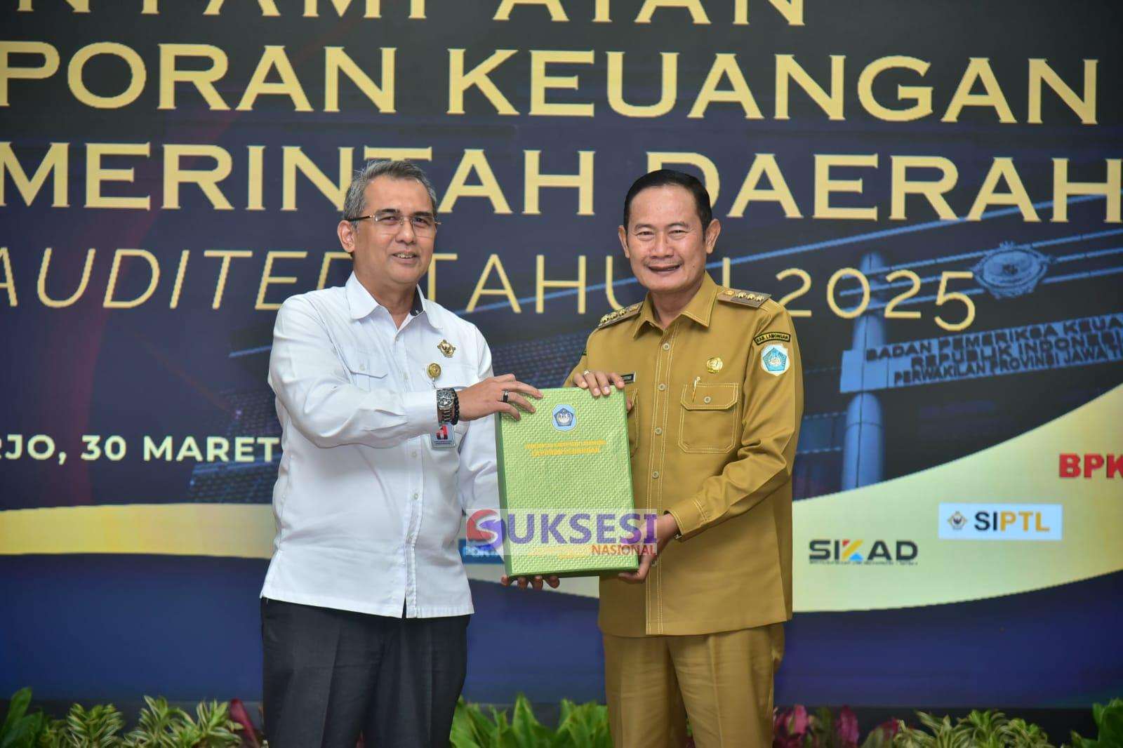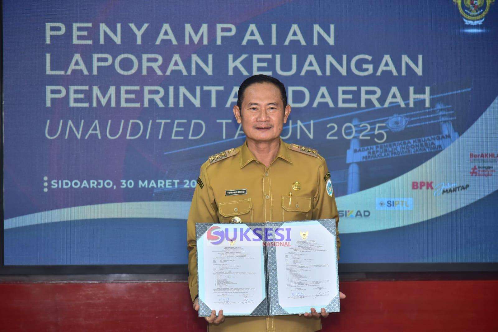 Lamongan, Suksesi Nasional.com – Bupati Lamongan Yuhronur Efendi pada Senin (30/3) menyerahkan Laporan Keuangan Pemerintah Daerah (LKPD) Unaudited Tahun Anggaran 2025 kepada pada Kepala Badan Pemeriksa Keuangan (BPK) Perwakilan Provinsi Jawa Timur Yuan Candara Djaisin, di Sidoarjo. Dalam kesempatan tersebut hadir pula Gubernur Jawa Timur Khofifah Indar Parawansa, menekankan tentang pentingnya akuntabilitas, transparansi, dan ketepatan sasaran program serta kegiatan daerah.
