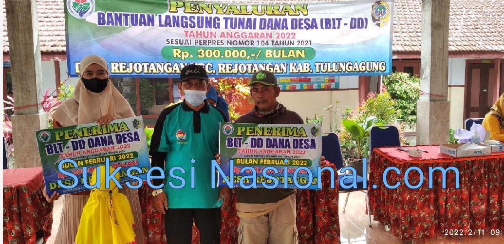 Suksesi Nasional Tulungagung- Bertempat di balai desa Rejotangan kecamatan Rejotangan kabupaten Tulungagung pada Jumat, 11 Februari mulai jam 9 pagi, pemerintah desa Rejotangan menyalurkan Bantuan Langsung Tunai Dana Desa (BLTDD) bulan Januari dan Februari atau tahap pertama dan kedua di tahun 2022.