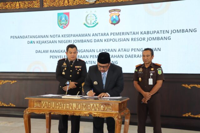 Suksesinasional.com JOMBANG – Pemerintah Kabupaten (Pemkab) Jombang bersama Kejaksaan Negeri (Kejari) Jombang dan Kepolisian Resor (Polres) Jombang resmi menandatangani Nota Kesepahaman (MoU) tentang Koordinasi Aparat Pengawas Internal Pemerintah (APIP) dan Aparat Penegak Hukum (APH) dalam Penanganan Laporan atau Pengaduan Penyelenggaraan Pemerintahan Daerah Kabupaten Jombang.