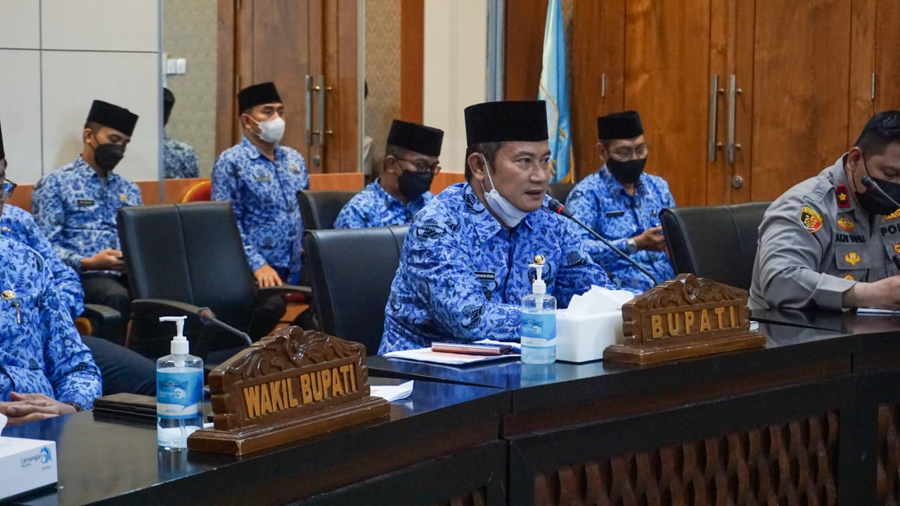 Pemerintah Kabupaten Lamongan menggelar koordinasi persiapan hari raya Iduil Fitri 1443 H bersama para Camat atau Musyawarah Pimpinan Kecamatan (Muspika) secara daring, Senin (18/4) di ruang Command Center Pemkab Lamongan Lt.3.