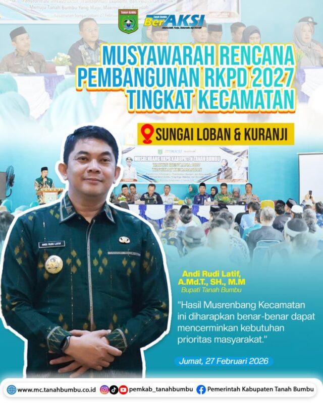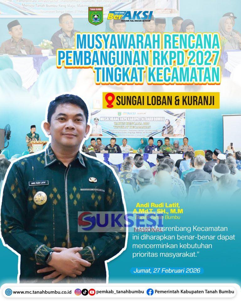 Suksesi Nasional.com Tanah bumbuBATULICIN – Pemerintah Kabupaten Tanah Bumbu ( Tanbu) menggelar Musyawarah Perencanaan Pembangunan (Musrenbang) Rencana Kerja Pemerintah Daerah (RKPD) Kecamatan tahun 2027 di dua kecamatan sekaligus. Yakni Kecamatan Sungai Loban dan Kecamatan Kuranji, Jumat (27/02/2026).