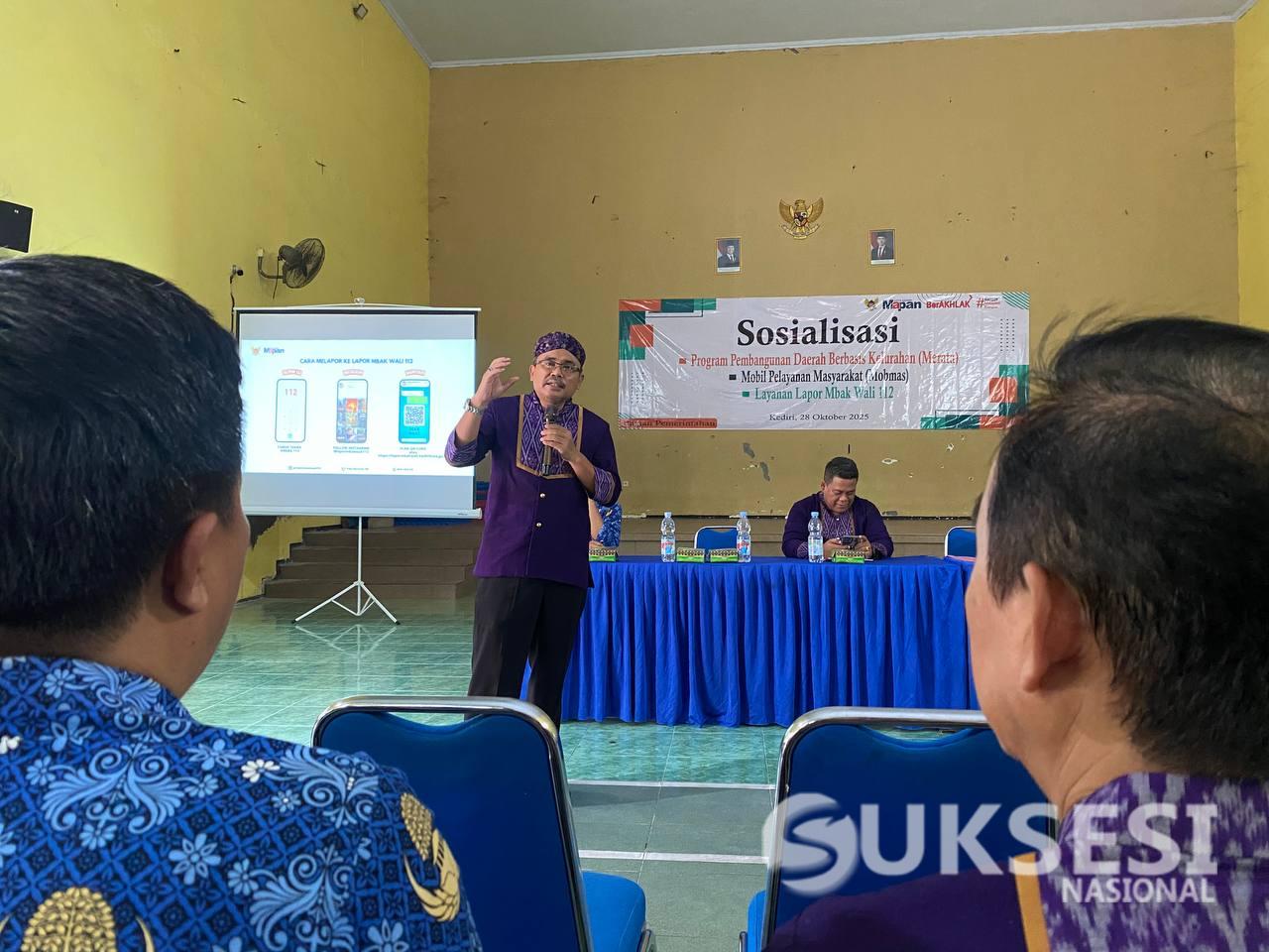 Suksesi Nasional, Kediri – Lakukan percepatan realisasi program unggulan Walikota Kediri, Pemerintah Kota Kediri melalui Bagian Pemerintahan menggelar Sosialisasi Program Unggulan kepada Lurah dan Kasi Kelurahan se-Kota Kediri di Aula Kelurahan Banjaran, Selasa (28/10). Adapun program unggulan yang disosialisasikan, meliputi: Program Pembangunan Daerah Berbasis Kelurahan (Merata), Mobil Pelayanan Masyarakat, dan Lapor Mbak Wali 112. Usai membuka kegiatan, Syamsul Bahri, Asisten Pemerintahan dan Kesra menjelaskan tujuan kegiatan yakni para lurah selaku pelaksana di lapangan dapat memahami dengan baik mengenai aturan, alur pelayanan, upaya melayani masyarakat sehingga semua program tersebut dapat berjalan baik di lapangan.