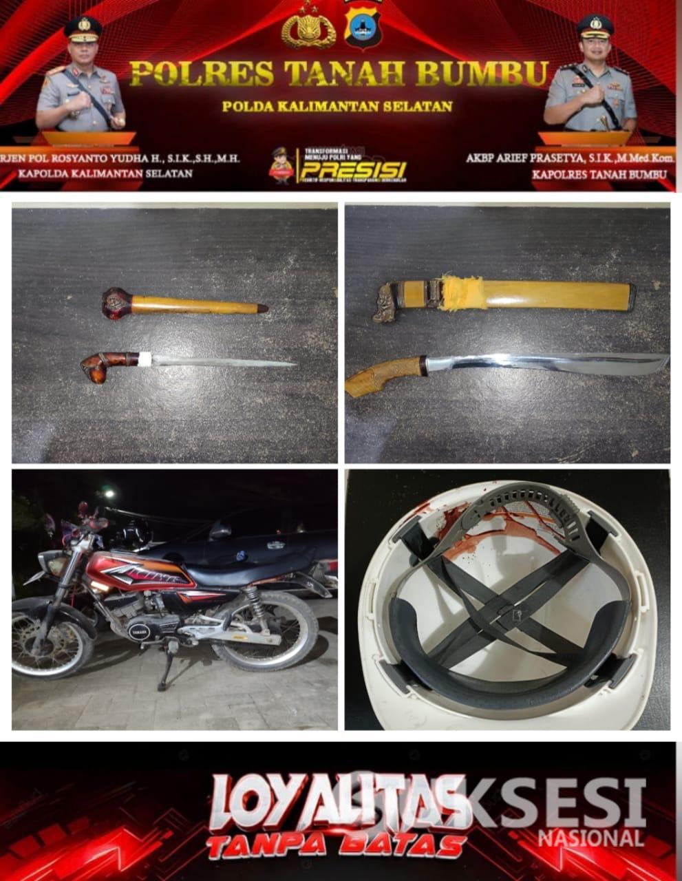 satu buah helm warna putih yang terdapat bercak darah, satu lembar surat visum et repertum, satu bilah senjata tajam jenis parang sepanjang 49 sentimeter beserta kumpangnya, satu bilah senjata tajam jenis keris sepanjang 29 sentimeter beserta kumpangnya, satu unit sepeda motor Yamaha RX King bernomor polisi DA 3882 CT warna merah.