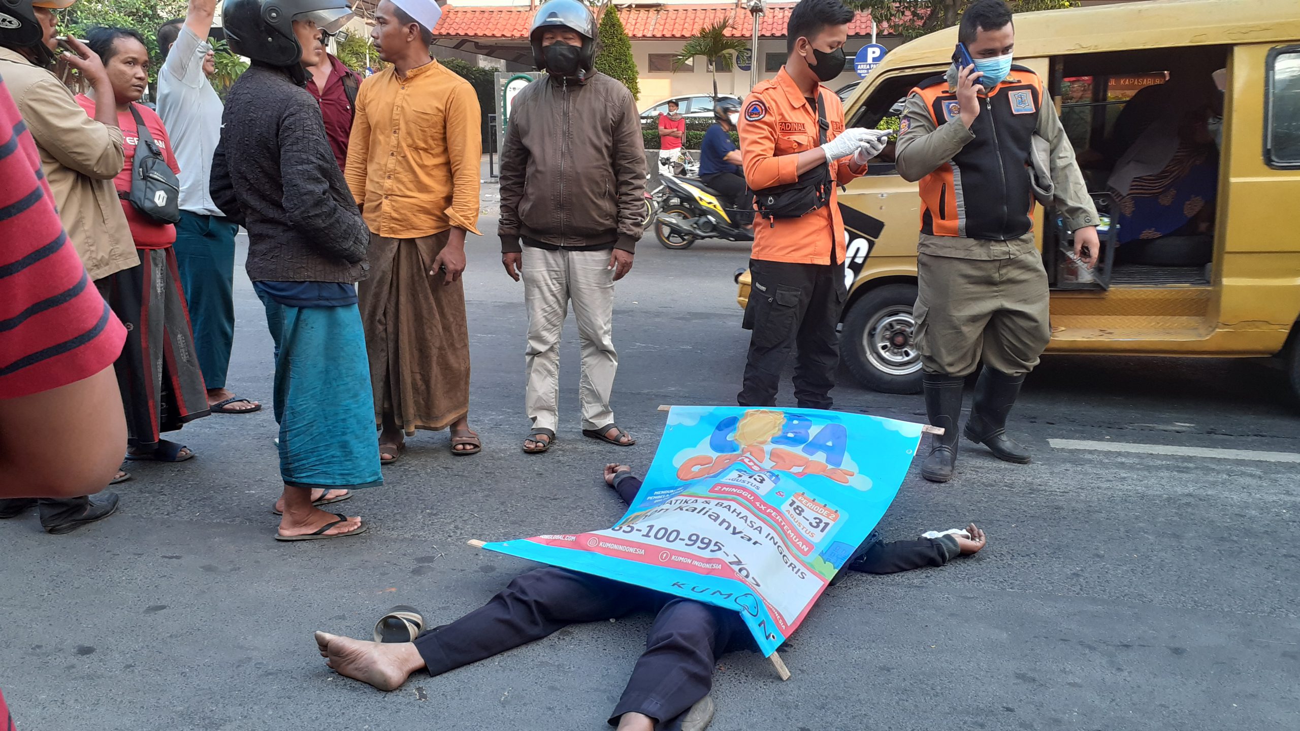 Menurut keterangan warga dilokasi kejadian, korban memakai jaket warna hitam mengenakan helm Gojek dari arah utara jalan Kapasari tiba – tiba berhenti dan jatuh dari atas kendaraannya.