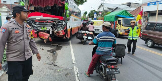 “Melihat adanya bus dari arah berlawanan, pengemudi bus AG 7767 US melakukan pengereman mendadak. Karena kecepatan tinggi, bus kemudian berubah arah dan berputar ke selatan hingga bagian belakang kendaraan menghantam dua sepeda motor tersebut”, terang Kapolsek.