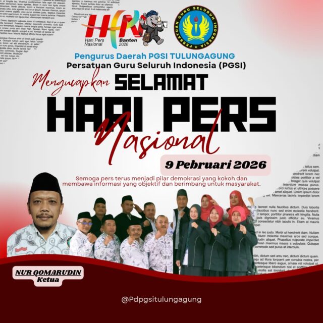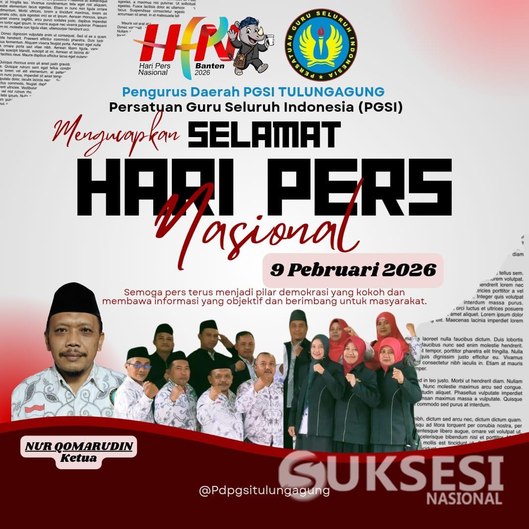 Beranda HeadlineHeadlineTulungagungPGSI (Persatuan Guru Seluruh Indonesia)Penulis Redaksi - Minggu, 1 Februari 2026, 17:18 WIB Mengucapkan selamat Hari Pers Nasional 9 Februari 2026Baca Juga : Kapolda Pimpin Sertijab Enam PJU dan Tiga Kapolres Jajaran Polda Jatim