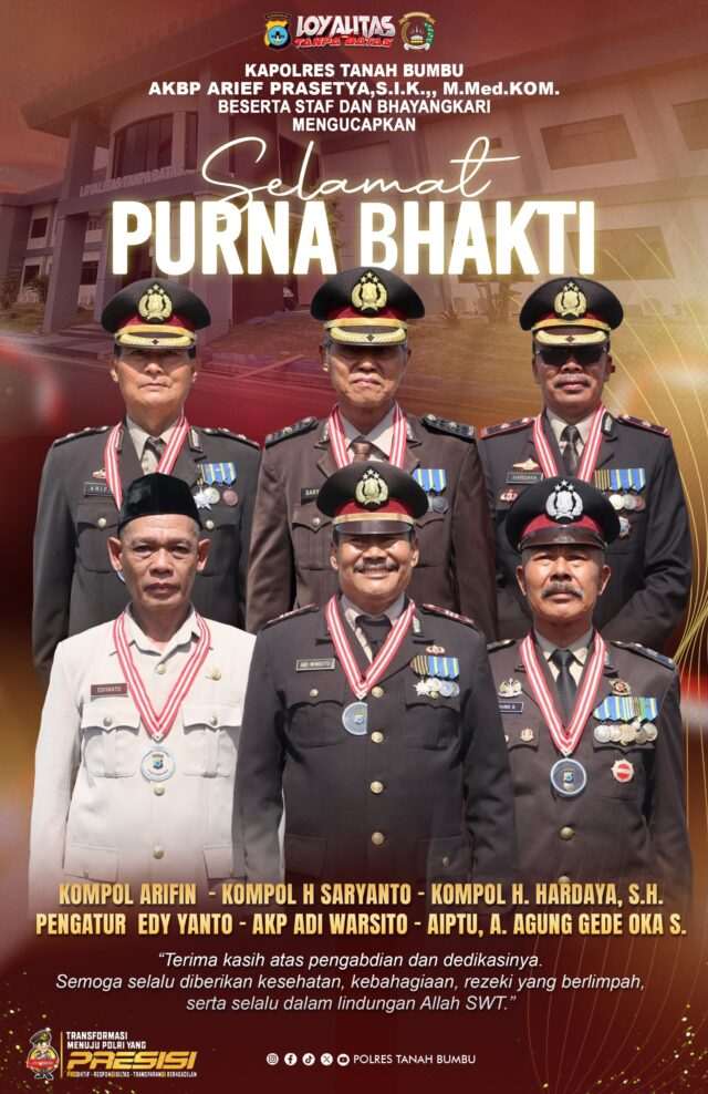 Jum’at 10 April 2026 sekitar jam 08.30 wita bertempat di joglo Wicaksana Laghawa Polres Tanah Bumbu telah dilaksanakan wisuda purna bhakti terhadap 6 personil Polres Tanah Bumbu.