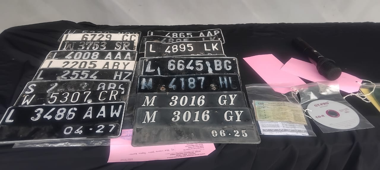Sementara dari RN polisi menyita barang bukti (BB) 17 lembar plat nomor sepeda motor, 1 unit sepeda motor Honda Vario 160 CC dengan Nopol L-3486- AAW ( milik korban), 1 unit sepeda motor Honda Vario warna hitam, 1 unit Honda Beat warna hitam, 2 buah senjata tajam (sajam).