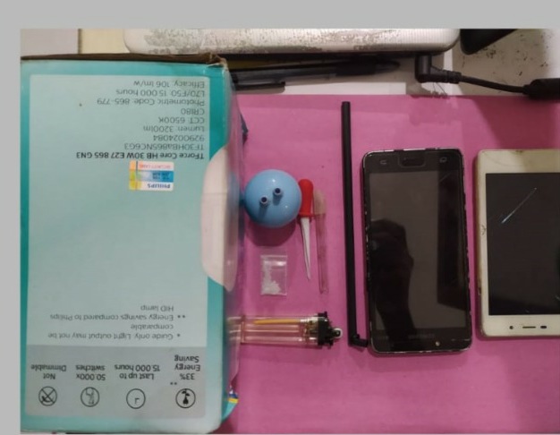 Ketika dilakukan penggeledahan ditemukan 1 buah pipet kaca, 1 korek api gas, 1 buah sedotan warna hitam, 1 buah potongan sedotan yang ujungnya runcing (Sekrop), 1 buah botol kecil dab 1 buah Hp merk Oppo warna putih.