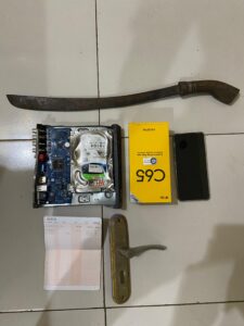 Sementara barang milik korban yang hilang yakni 1 buah handphone merk Realme, sebilah parang, 1 buah Recorder CCTV, mesen CCTV merk Ayuha, 1 buah Buku Rekening BNI dan 1 buah gagang pintu,” terang IPTU Dedy.