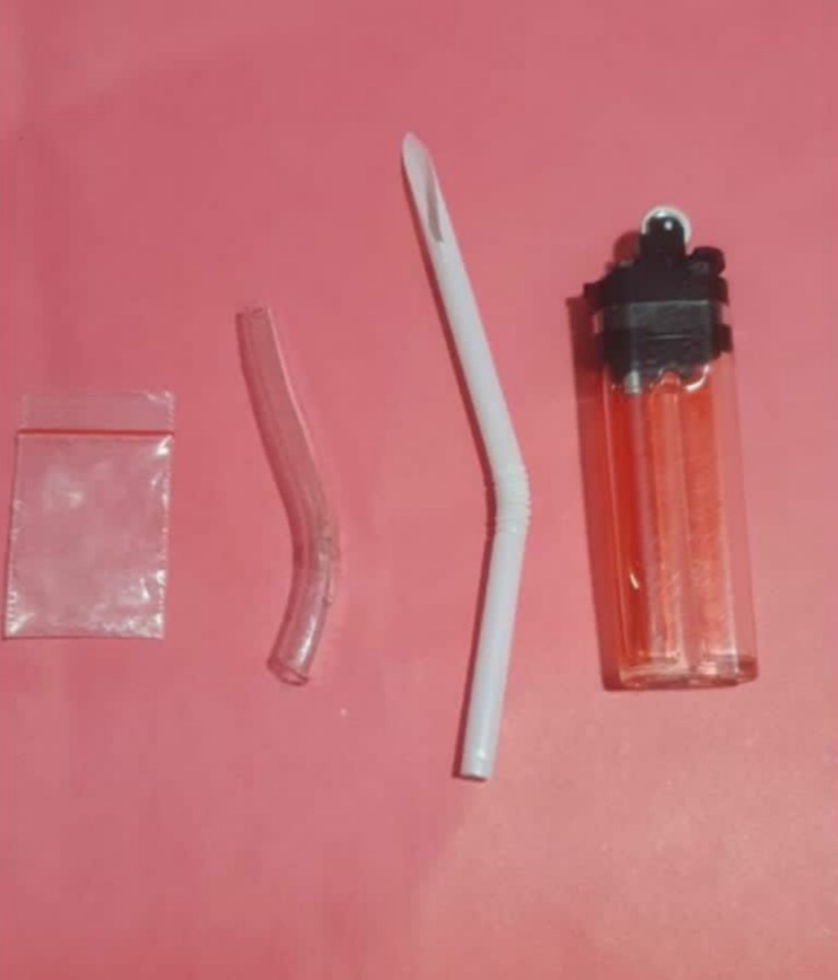 1 buah pipet kaca di dalamnya terdapat narkoba seberat ± 2,13 gram beserta pipet kacanya dan 1 buah skrop / serok sabu terbuat dari sedotan plastik warna putih serta 1 buah korek api gas.