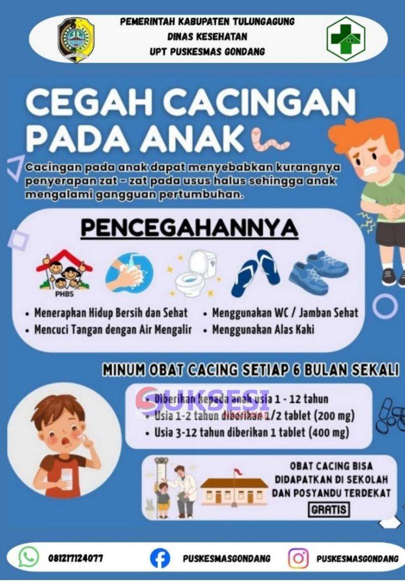 Suksesi nasional.com Tulungagung – Guna menekan angka cacingan dan meningkatkan kesehatan anak, Puskesmas Gondang kecamatan Tulungagung kabupaten Tulungagung melaksanakan program pemberian obat cacing sesuai sasaran anak usia 1-12 tahun,d mulai pada bulan april 2026 se-wilayah kerja Puskesmas Gondang Kecamatan Tulungagung .