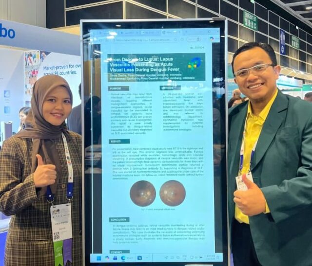 Dalam sesi presentasi poster ilmiah, dr. Dinda Zhafira dan dr. H.M. Sjarifudhin memaparkan laporan kasus medis yang unik sekaligus menantang secara diagnostik dengan judul “From Dengue to Lupus: Lupus Vasculitis Presenting as Acute Visual Loss During Dengue Fever.”