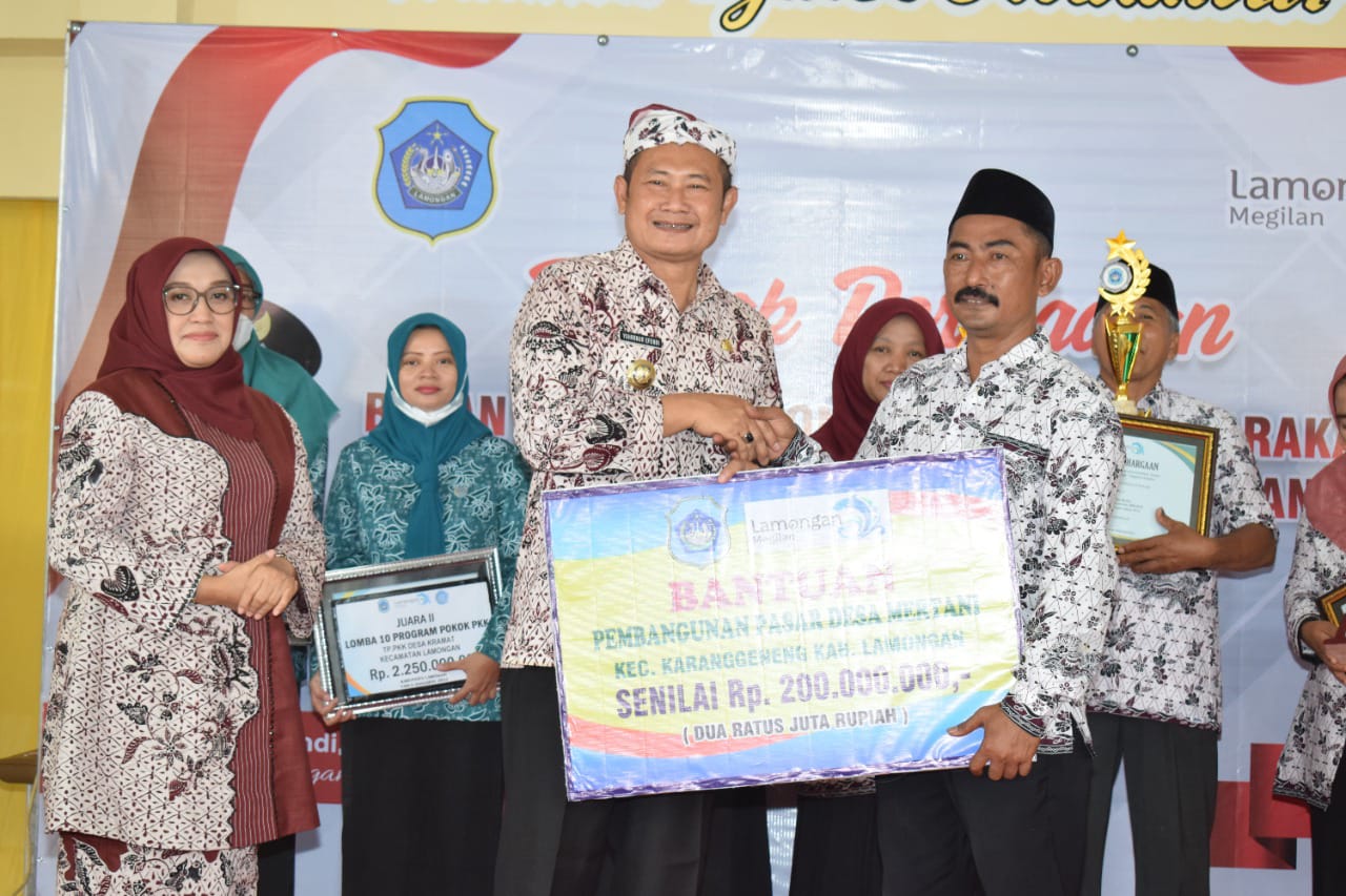 Berbagai penghargaan dan bantuan juga turut diserahkan, mulai dari bantuan dana pembangunan pasar burung, penghargaan lomba BBGRM 2022, penghargaan lomba 10 pokok PKK hingga bantuan bendera merah putih kepada masyarakat desa.