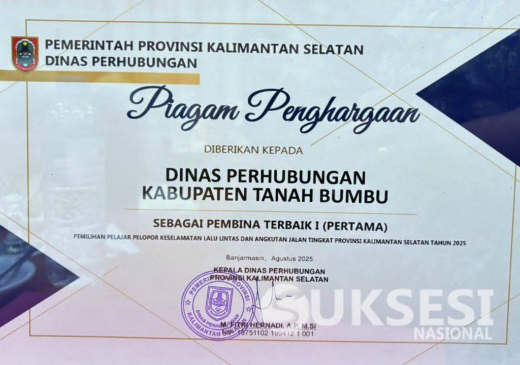 Suksesi Nasional.com Tanah Bumbu BATULICIN – Pemerintah Kabupaten Tanah Bumbu (Pemkab Tanbu) melalui Dinas Perhubungan meraih dua penghargaan sekaligus pada ajang pemilihan Pelajar Pelopor Keselamatan Lalu Lintas dan Angkutan Jalan (PPKLLAJ) Tingkat Provinsi Kalimantan Selatan Tahun 2025 yang digelar 18-19 Agustus di Banjarmasin.