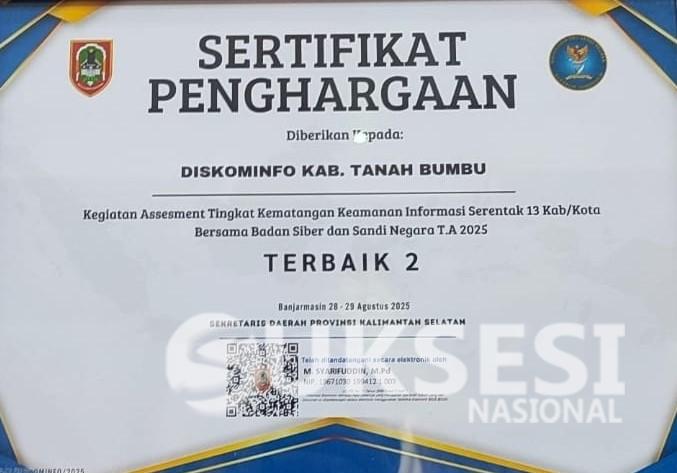 Suksesi Nasional.com, Tanah Bumbu BATULICIN – Pemerintah Kabupaten Tanah Bumbu melalui Dinas Komunikasi Informatika Statistik dan Persandian (Diskominfosp) berhasil meraih peringkat terbaik kedua dalam penilaian tingkat kematangan keamanan informasi dari 13 kabupaten/kota se-Kalimantan Selatan. Penilaian ini dilakukan oleh Badan Siber dan Sandi Negara (BSSN) pada 28–29 Agustus 2025 di Banjarmasin.