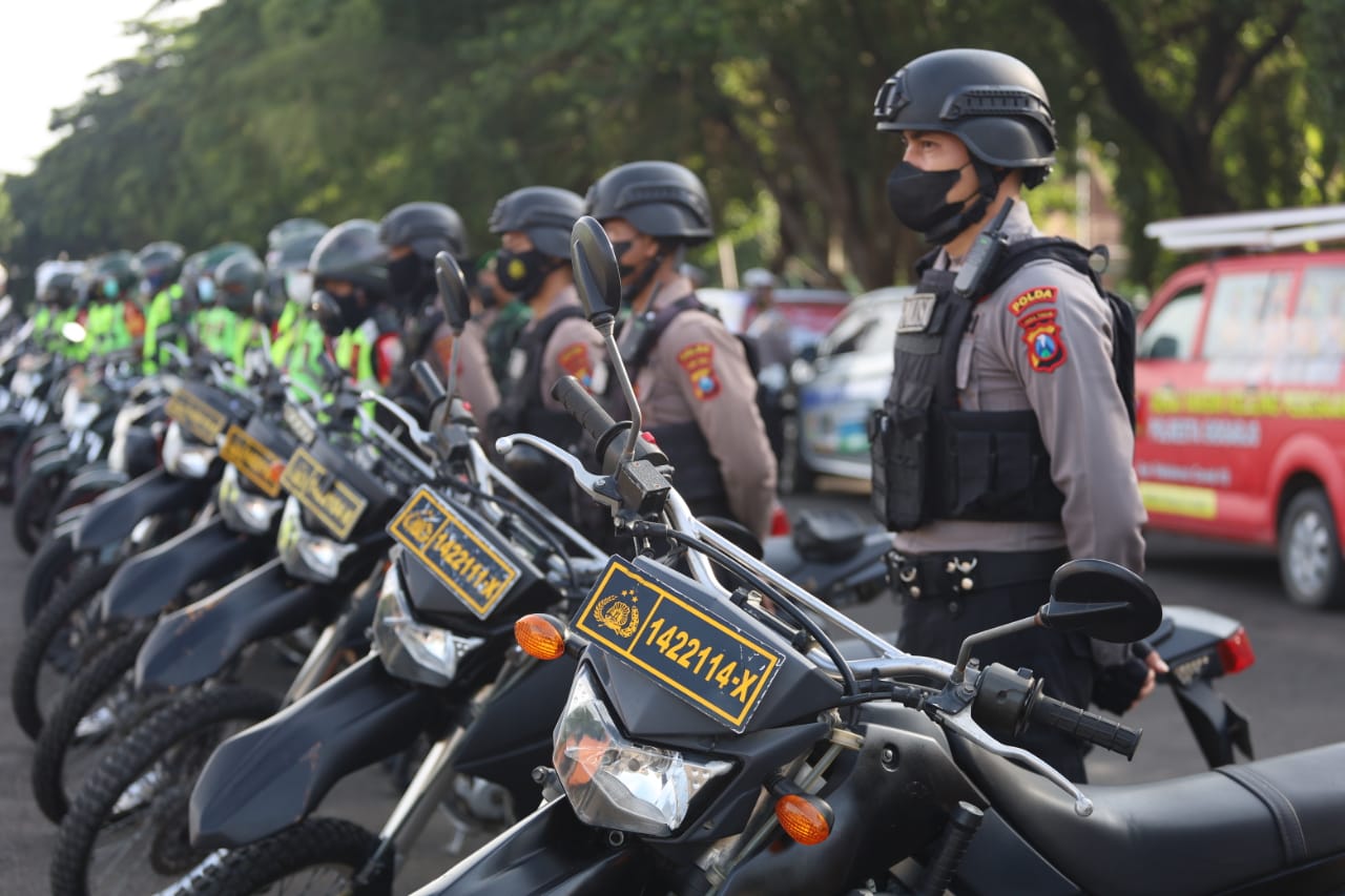 Suksesi Nasional, Surabaya – Forum Komunikasi Pimpinan Daerah (Forkopimda ) Jawa Timur gelar pasukan patroli motor penegakan protokol kesehatan untuk masyarakat Jawa Timur (Pamor Keris) di lapangan Kodam V/Brawijaya Senin (24/01/2022) pagi.
