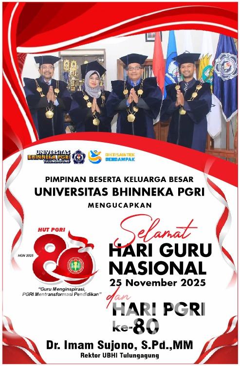 Beranda Headline HeadlineTulungagung UBHI TULUNGAGUNG MENGUCAPKAN SELAMAT MEMPERINGATI HARI GURU 25 NOVEMBER 2025 DAN HARI PGRI KE 80 Penulis Redaksi - Jumat, 14 November 2025, 13:49 WIB