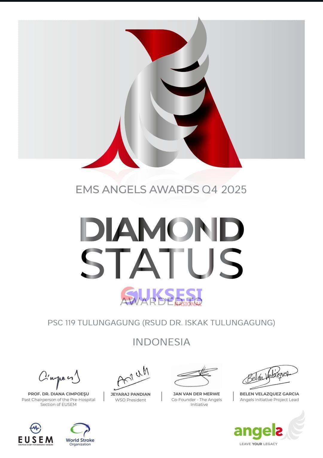 Suksesi nasional. Com Tulungagung – Layanan kegawatdaruratan medis RSUD dr. Iskak Tulungagung kembali mencatatkan prestasi membanggakan di kancah global. Tim Public Safety Center (PSC) 119 Tulungagung berhasil meraih penghargaan tertinggi, yaitu Diamond Status, dalam ajang EMS Angels Awards Kuartal 4 (Q4) Tahun 2025.