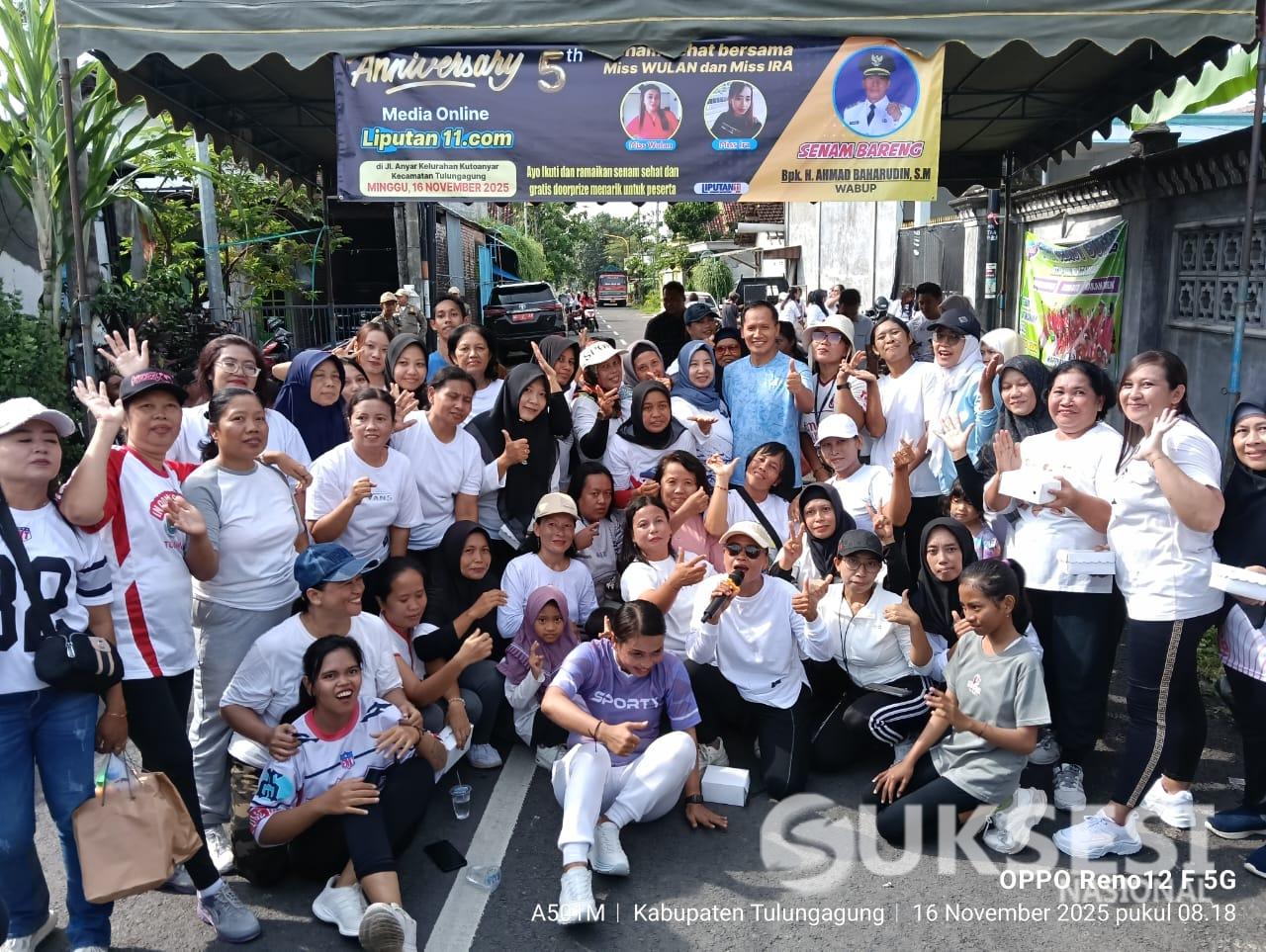 Suksesi nasional.com Tulungagung – Wakil Bupati Tulungagung Ahmad Baharudin beserta Ny. Yuyun Baharudin hadiri senam sehat bersama ratusan warga dan masyarakat dalam rangka memperingati HUT Media Liputan 11 ke 5, di Kelurahan kutoanyar kecamatan Tulungagung kabupaten Tulungagung Minggu (16/11/2025) pagi.