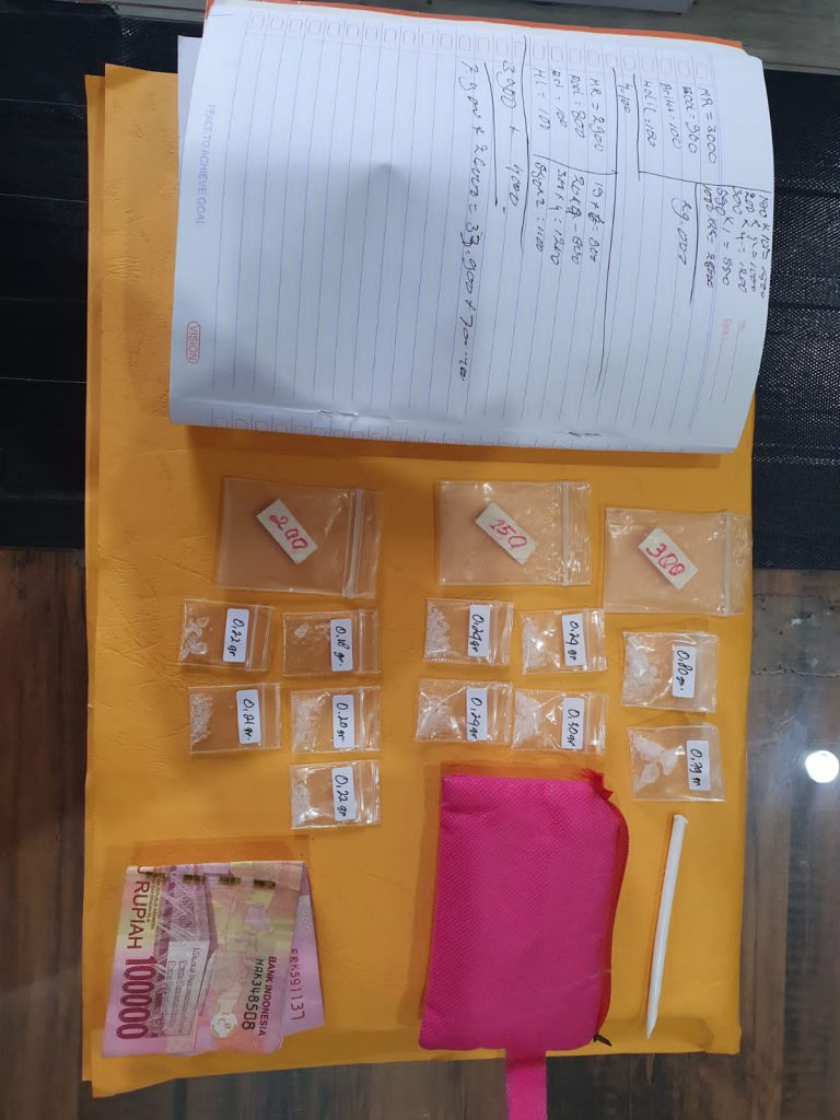 Tak tanggung – tanggung, polisi menyita barang bukti (BB) 11 bungkus plastik terdapat kristal putih di duga narkotika jenis sabu seberat + 3,64 gram beserta pembungkusnya, 1 buku catatan penjualan, 1 skrop, 1 buah dompet kecil warna merah muda, uang tunai Rp. 200.000, 1 unit handphone merk Samsung J-7 warna putih.